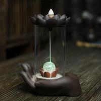 Ceramic Folk Art Windproof Cover Backflow Incense Burner Home Decoration Creative Buddha Hand Lotus LED Light Gifts